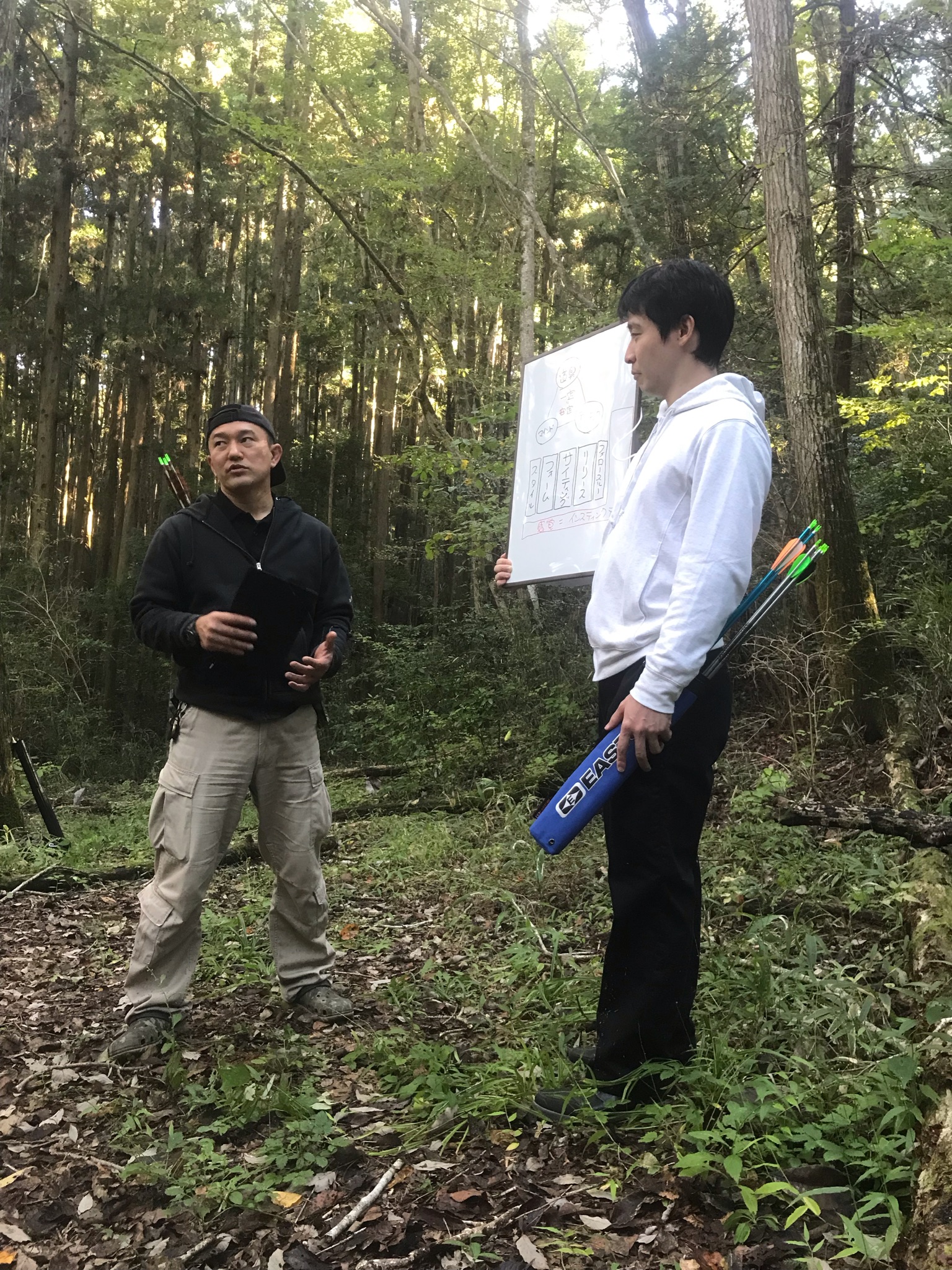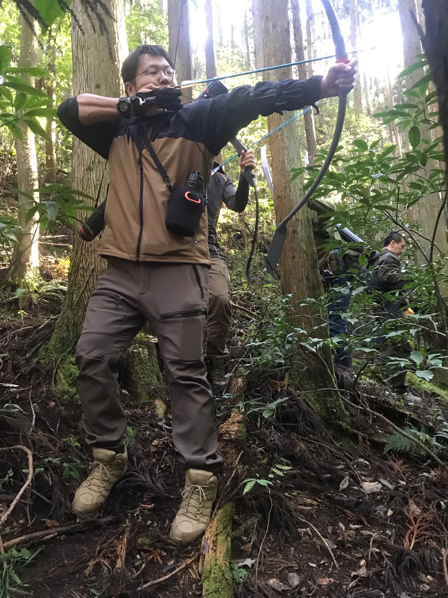 2日目の午後は森の中を全員で移動しながら、安全に射てる場所を探し、一本の矢で勝負します。全員との一発勝負です!これは、ロービング とも呼ばれる練習で、フィールドアーチェリー競技にも通じます。この練習で得るものは多く、・距離読み・平地だけでない様々な環境の中での射・一発勝負に怯まない強いマインドだけでなく、なにより安全の確保を意識する様になります。