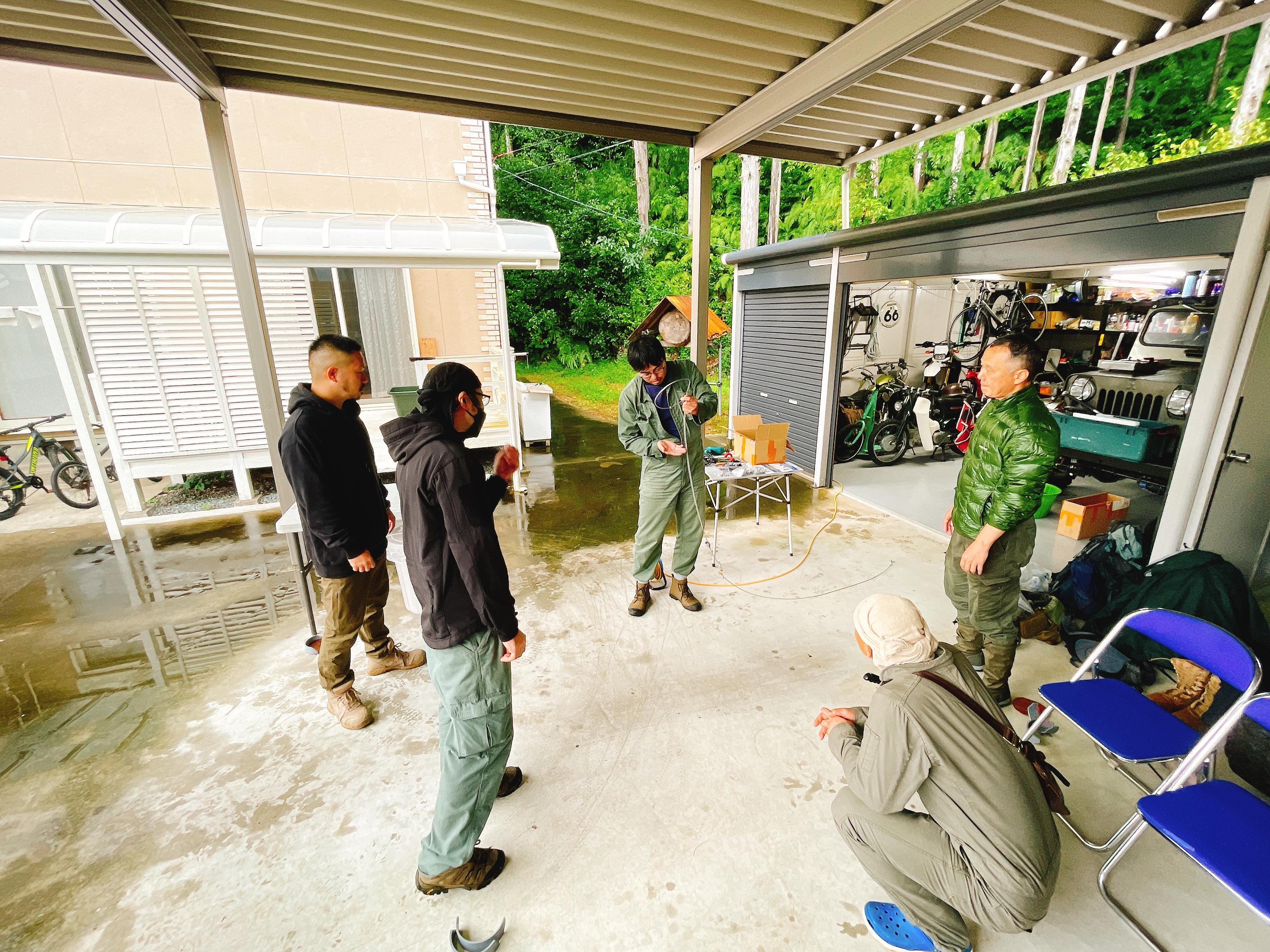 2泊3日組は、この自作くくり罠一式を持って強く降る雨の中、再び野生に勝負を挑みに山中へ。