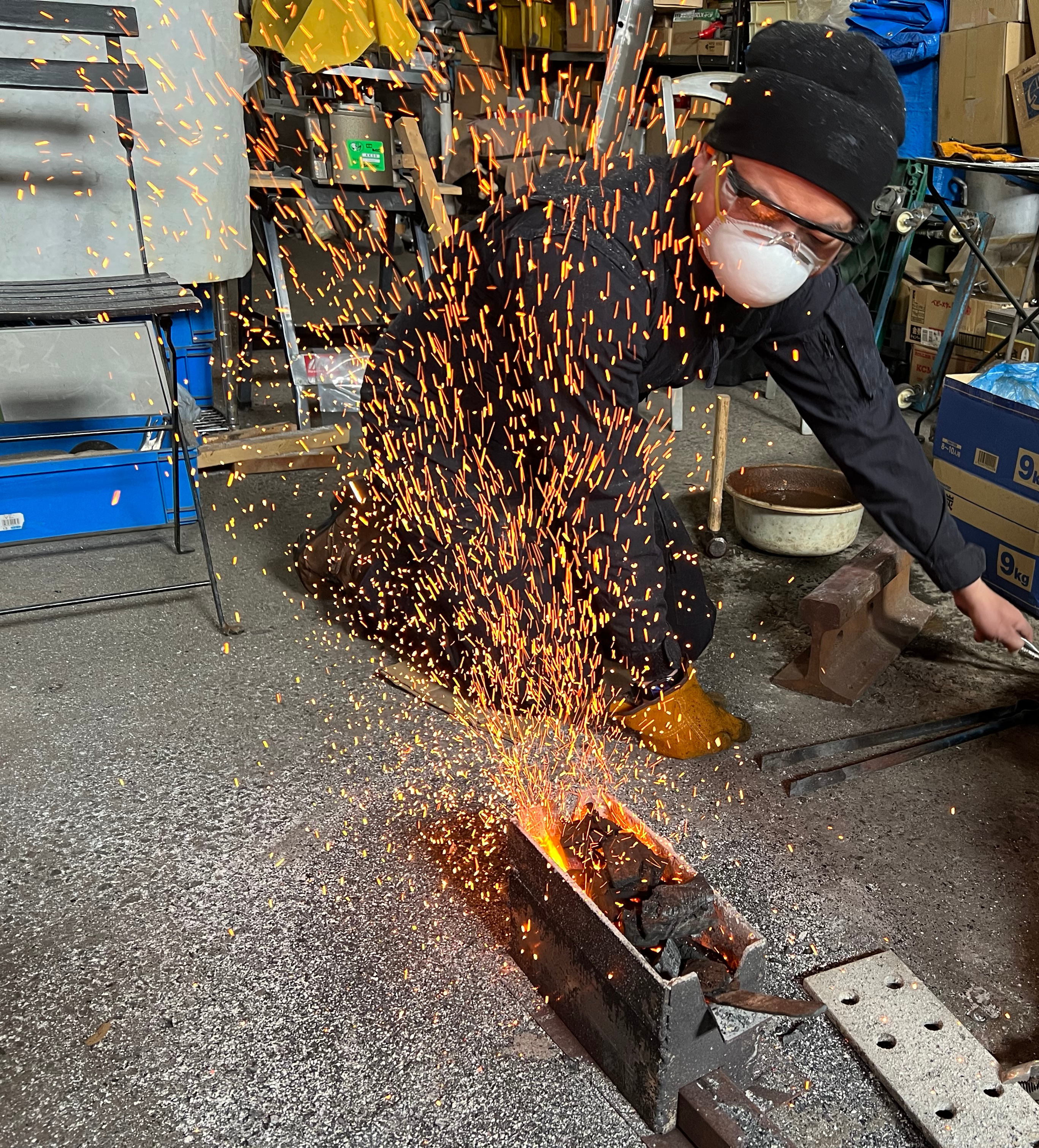 冬のハマラボはかなり寒いですが、火の前でハンマーをふるい続けると汗ダクです(笑)