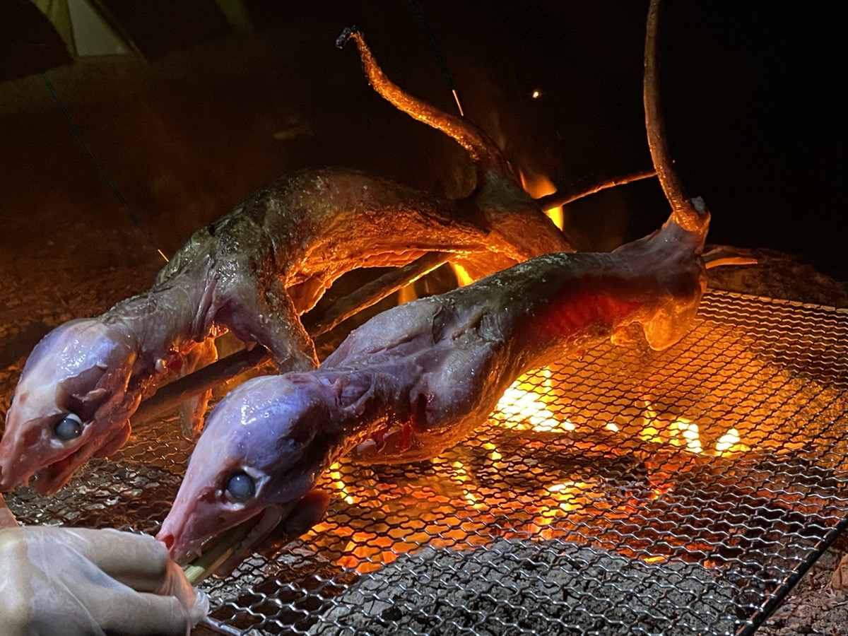 ハンティングキャンプ直前に獲れた獲物を丸焼き用に準備してくれていたんです。